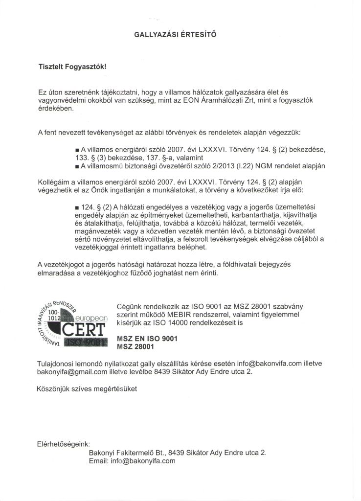 A Bakonyi Fakitermelő Bt az E. ON Áramhálózati Zrt megbízásából gallyazási és nyiladéktisztítási munkálatokat végez, melyek élet- és vagyonvédelmi okokból történnek. A hálózatok karbantartási munkálataiat és a gallyazási munkákat egész évben, folyamatosan végzik.